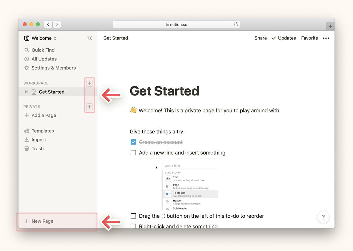참고: Notion을 직접 사용하는 경우 사이드 바에 Workspace 표제가 표시되지 않을 수 있습니다. 더 많은 사람들을 당신과 함께 초대할 때 나타납니다.