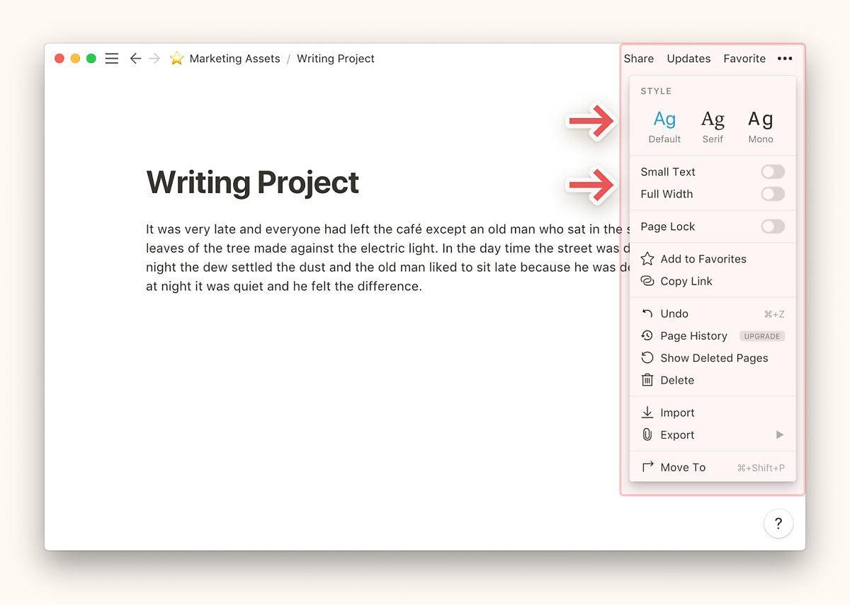 페이지의 오른쪽 상단 ••• 메뉴에서 페이지 너비와 함께 텍스트 글꼴과 크기를 변경할 수도 있습니다:
