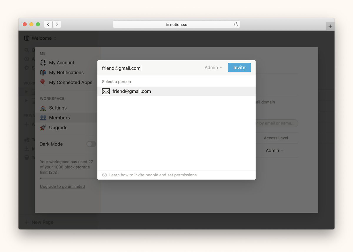 전체 작업 공간이 아닌 페이지 중 하나에서만 공동 작업을 원한다고 가정해 봅시다. 손님으로 개별 페이지에 사람들을 초대할 수 있습니다. 방법은 다음과 같습니다: