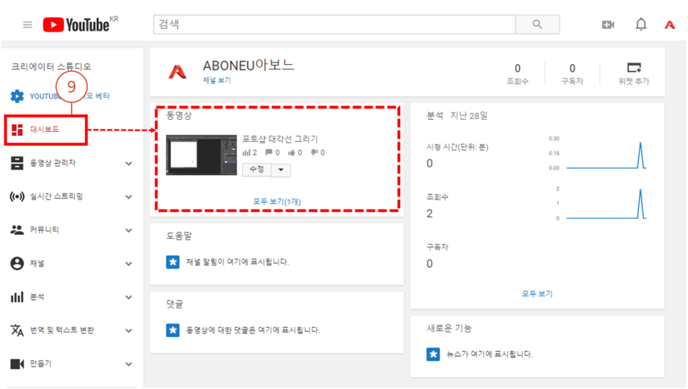 9. 크리에이터 스튜디오 "대시보드"로 가서 확인해 보면 "포토샵 대각선 그리기"란 동영상 1개가 올라가 있습니다.