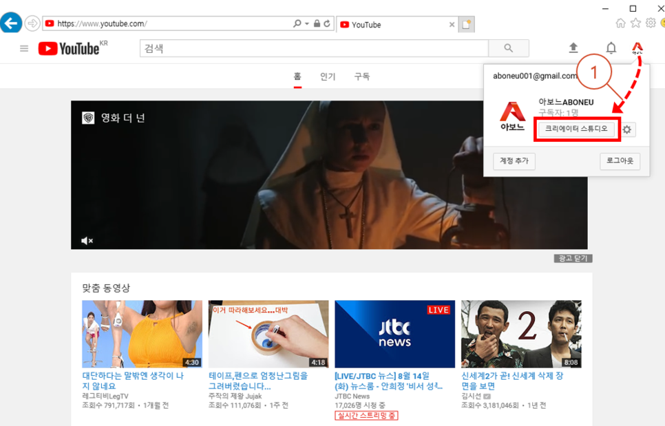 1. 유튜브 사이트에 로그인 후 우측 상단 아이콘을 클릭한 상태에서 "크리에이터 스튜디오"를 클릭