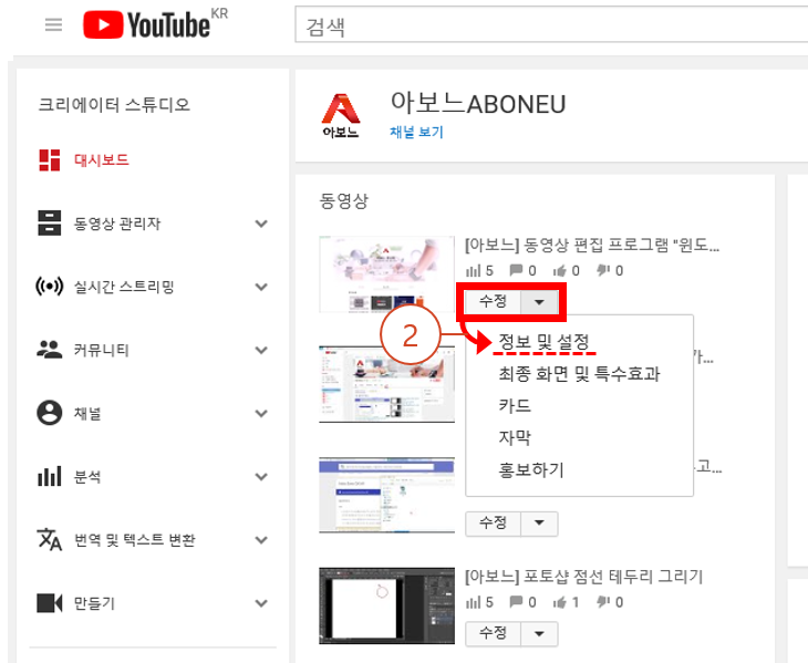 2. 대시보드 화면 상에서 썸네일 사진을 변경하고픈 곳에 "수정"을 클릭 후 "정보 및 설정"을 클릭합니다.