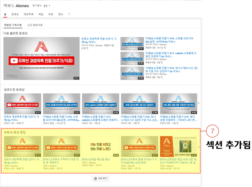 7. 유튜브 첫 화면에 "섹션 추가"된 화면입니다.