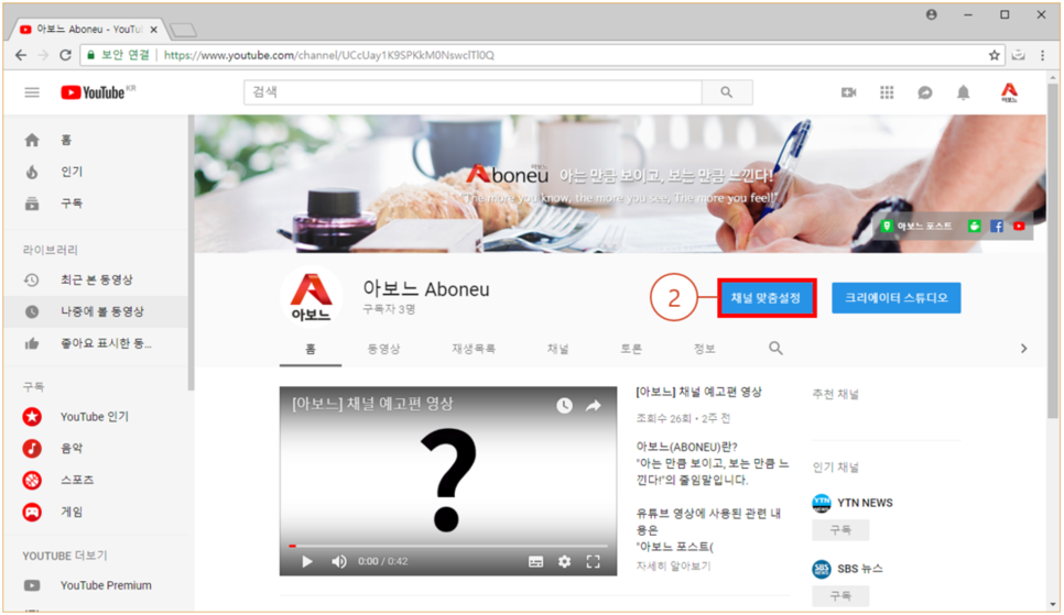 재생목록에 동영상을 추가하면 역순으로 올라갑니다. 이것을 정방향으로 변경하는 방법입니다. (크롬 브라우저 기준) [ ▼ 하단 유튜브 영상으로 상세 설명! ] 1. 유튜브 로그인 > 채널 아이콘 클
