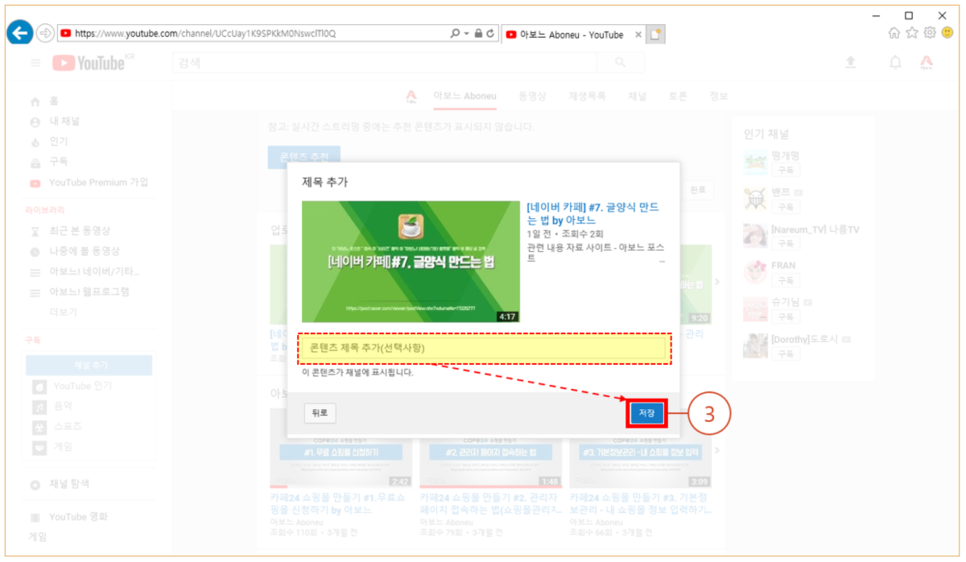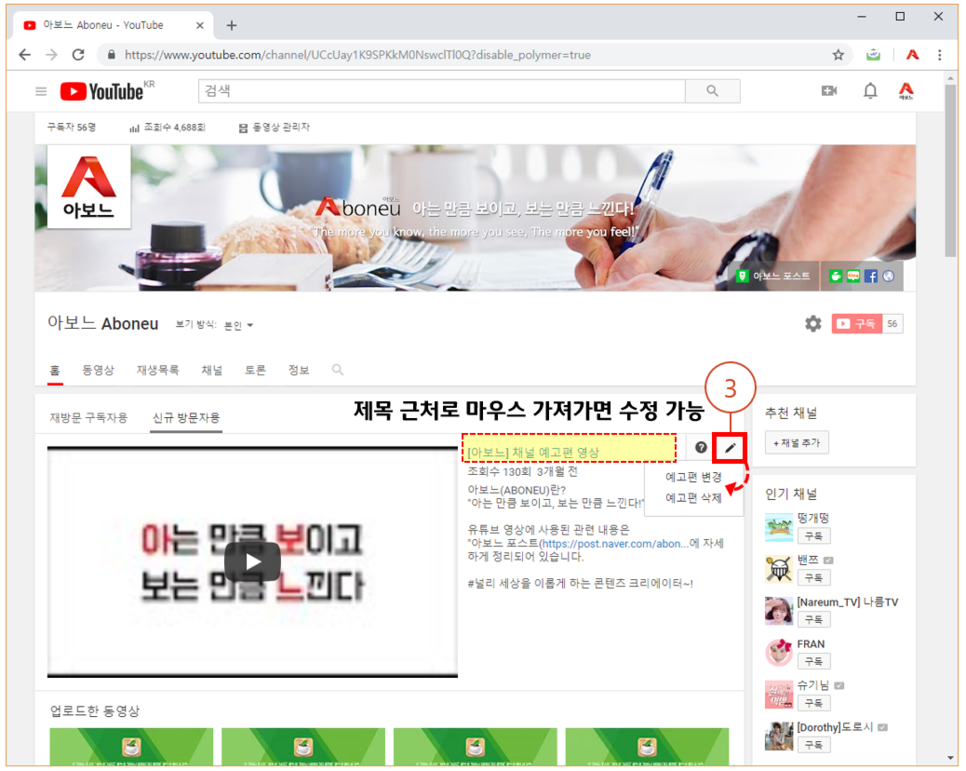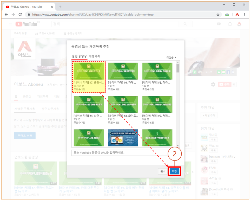 2. 자신이 올린 영상 중 강조하고 픈 영상 선택 후