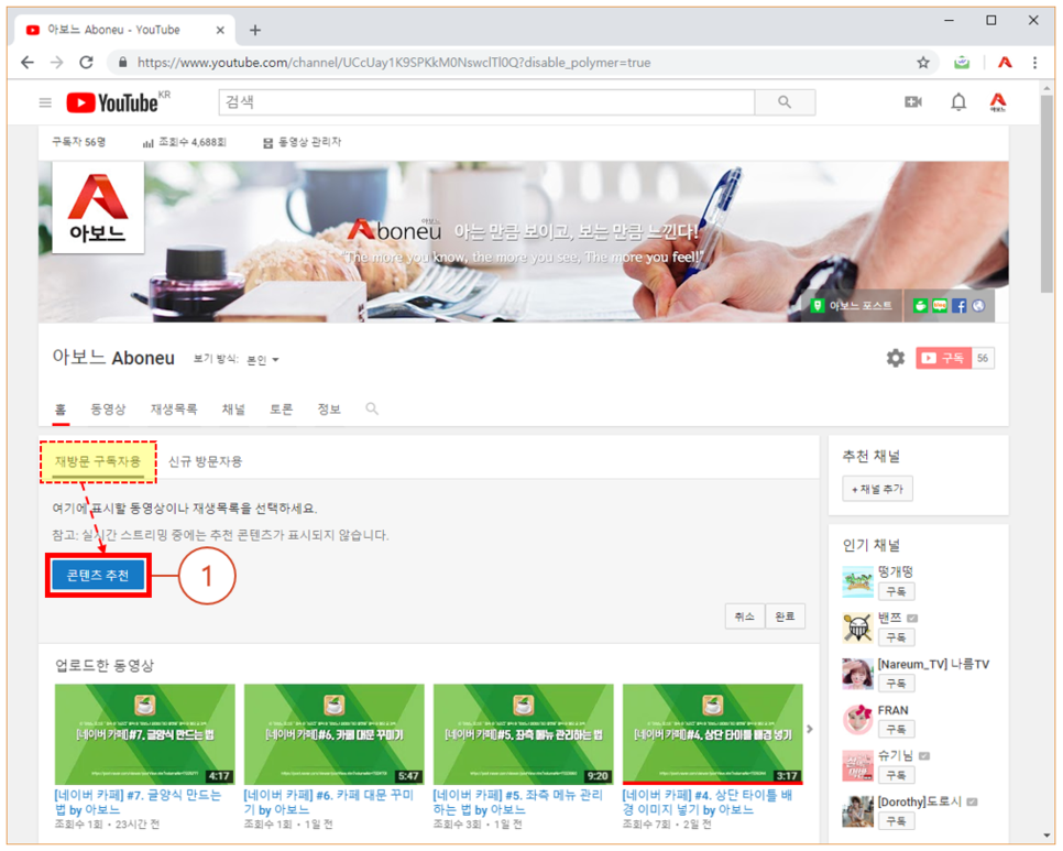 1. 내 채널 > 홈 > "재방문 구독자용" 탭 클릭 후