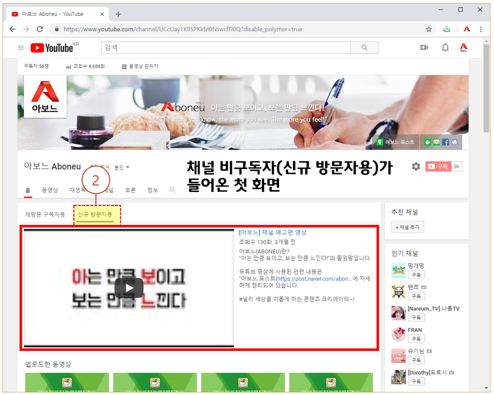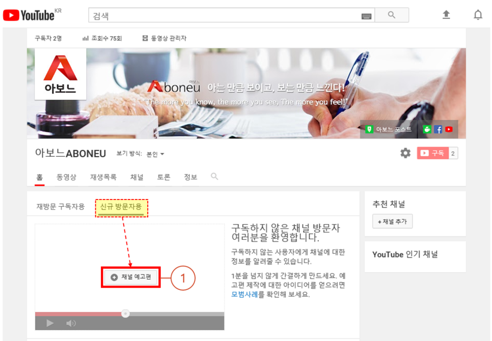 1. 내 채널 > 홈 > "신규 방문자용" 탭 클릭 후