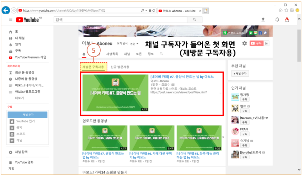 채널 구독자가 들어온 첫 화면(재방문 구독자용)