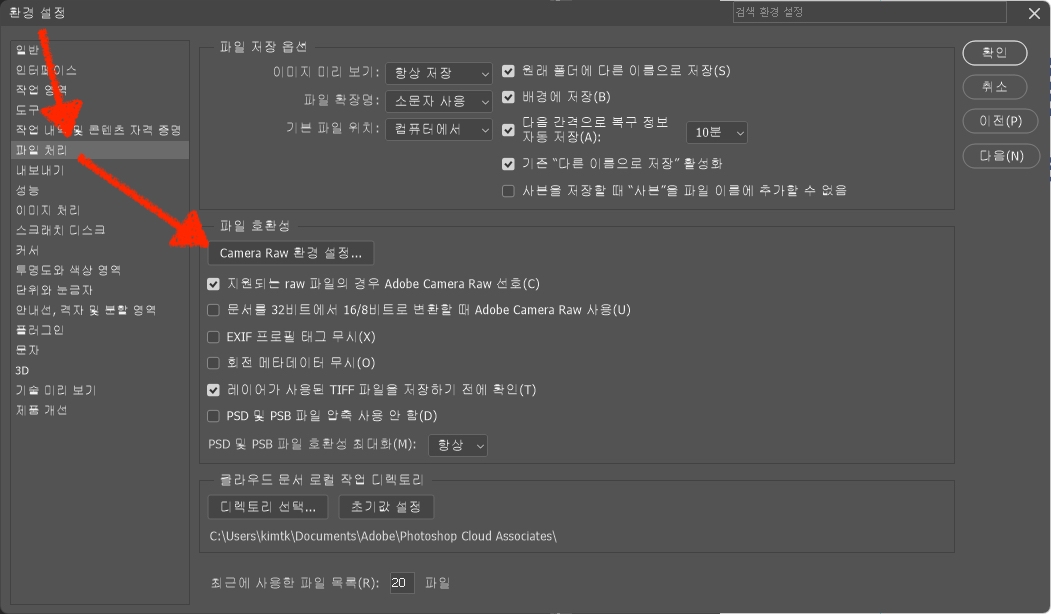 포토샵 상단 메뉴 > 환경 설정 > 파일 처리 > 파일 호환성 > 'Camera Raw 환경 설정' 클릭