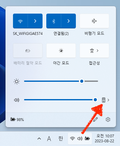 컴퓨터 작업표시줄 > 오디오 아이콘 클릭 > 스피커 옵션 선택