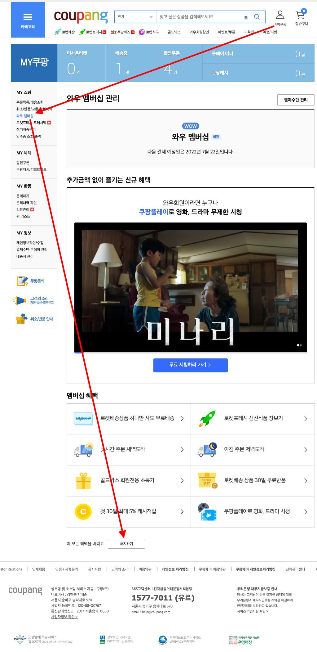"쿠팡(coupang) 사이트에서 로켓와우 멤버십을 해지하는 위치입니다."