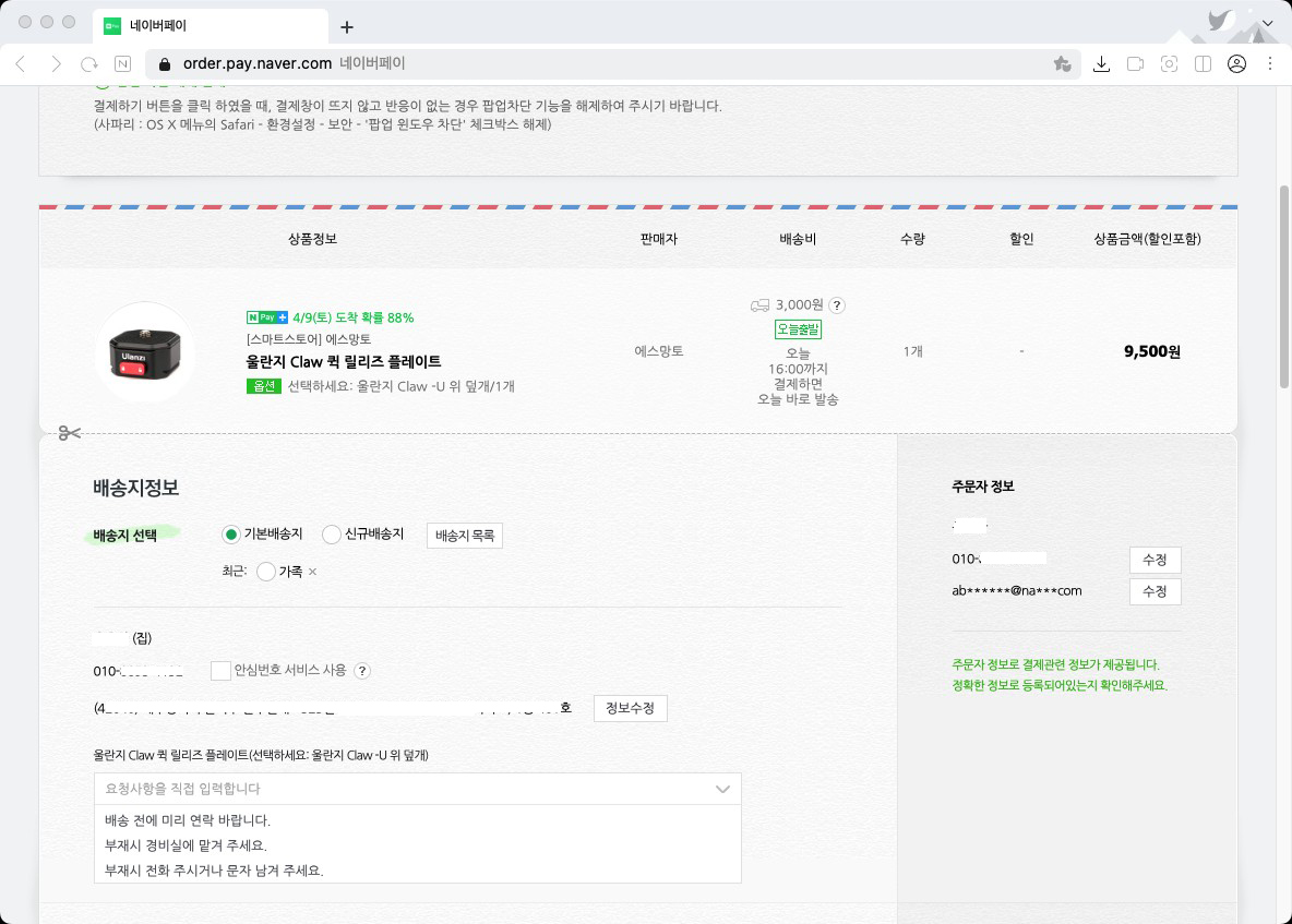 "네이버페이 구입 시 배송메시지가 한번 입력되면 내가 삭제할 수 없어서 고객센터로 메일을 보내서 요청해야 삭제가 됩니다!"