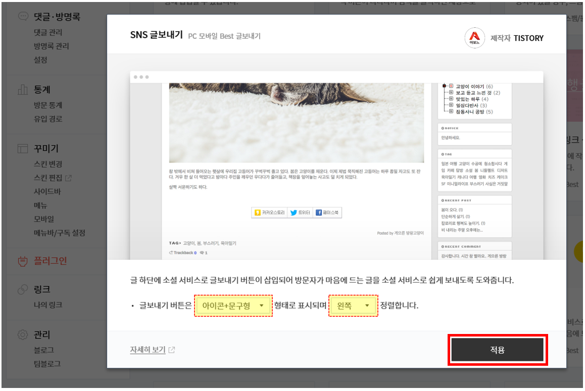 티스토리 관리자 페이지 > 좌측 메뉴 '플러그인' 클릭 > 'SNS 글보내기' 클릭